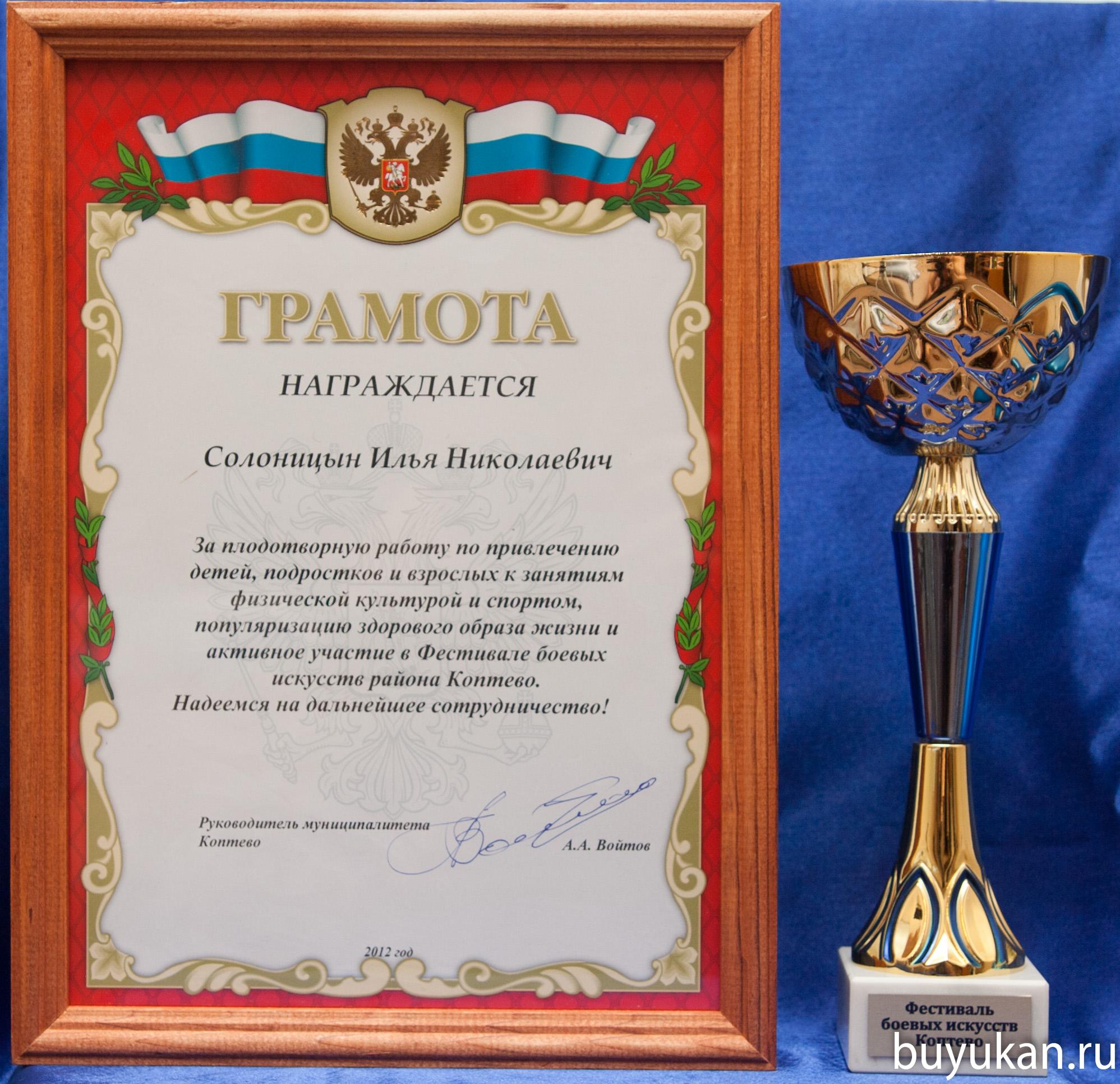 | 18 октября 2012 года состоялся ежегодный Фестиваль боевых искусств района Коптево, в котором принимали участие спортсмены из различных клубов единоборств: кекусинкай карате, капоэйра, дзюдо, каратэ сито-рю. С показательной программой на Фестивале выступили ученики и инструктора нашего клуба. На церемонии награждения руководителю нашего клуба - Солоницыну Илье Николаевичу был вручен памятный кубок и диплом за плодотворную работу и успехи в развитии физкультуры и спорта. |